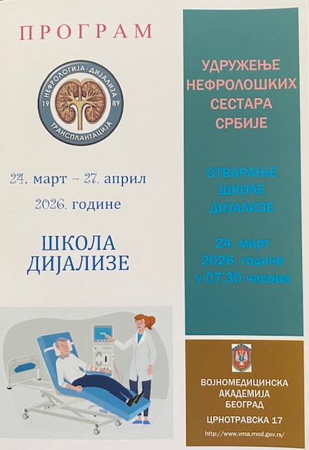 Школа дијализе под покровитељством Удружења нефролошких сестара Србије одржава се другу годину заредом у периоду од 24. марта до 27. априла 2026. године у Клиници за нефрологију-хемодијализа Војномедицинске академије.
